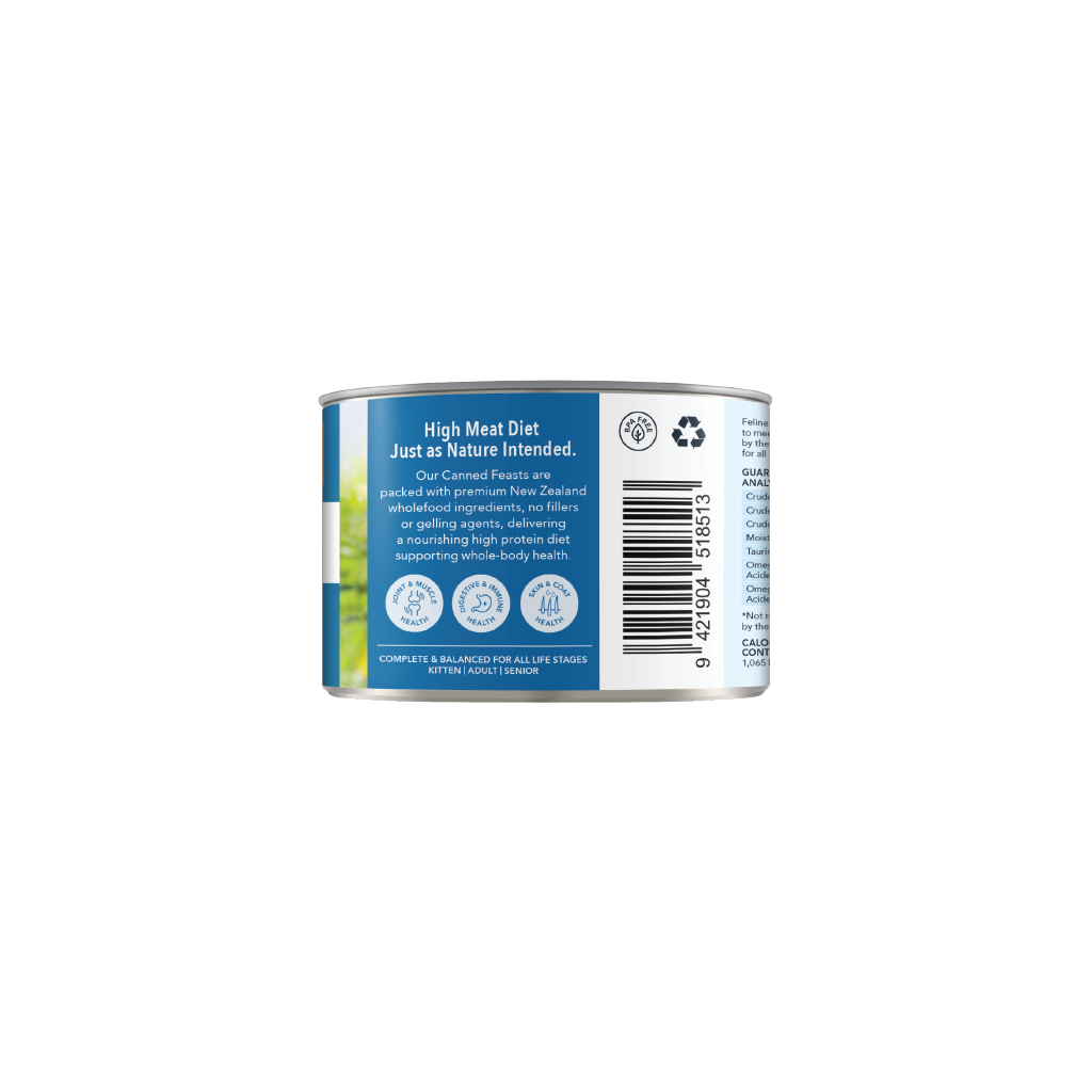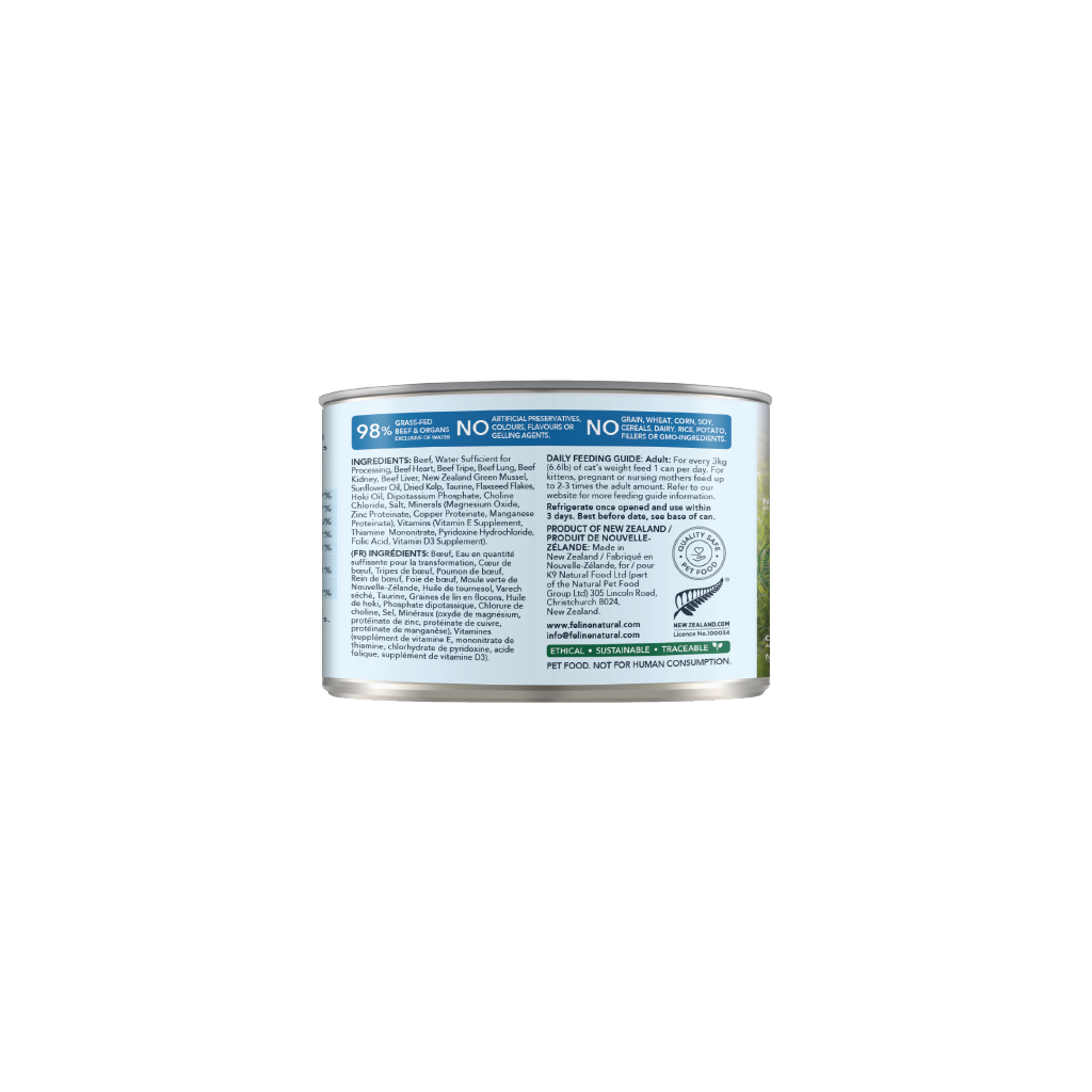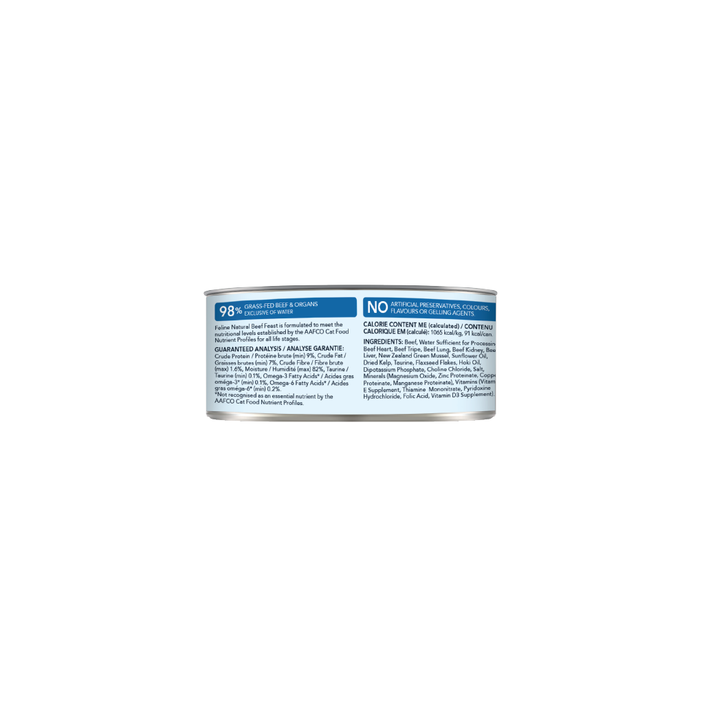 Our complete and balanced New Zealand Beef Feast Cans contain 98% Grass-Fed & Grass-Finished Beef & Organs, with New Zealand Green Mussels, Flaxseed Flakes, Oils, Kelp, Vitamins, Minerals and Taurine in support of your cat's whole-body health.