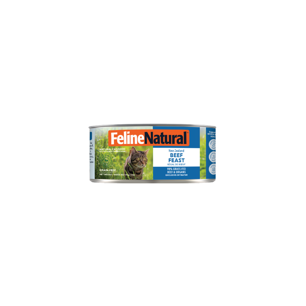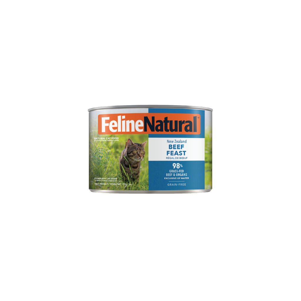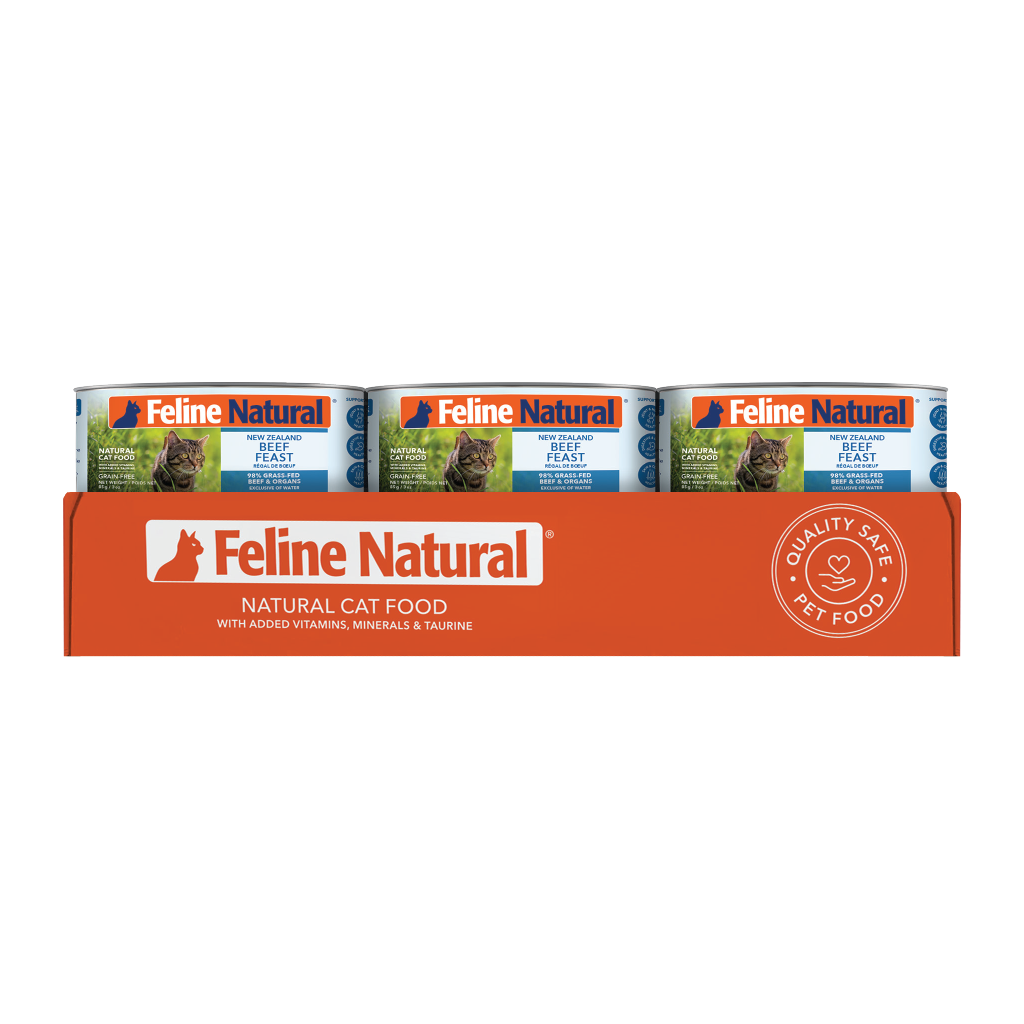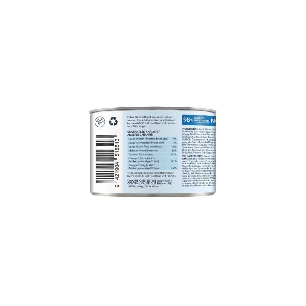 Our complete and balanced New Zealand Beef Feast Cans contain 98% Grass-Fed & Grass-Finished Beef & Organs, with New Zealand Green Mussels, Flaxseed Flakes, Oils, Kelp, Vitamins, Minerals and Taurine in support of your cat's whole-body health.