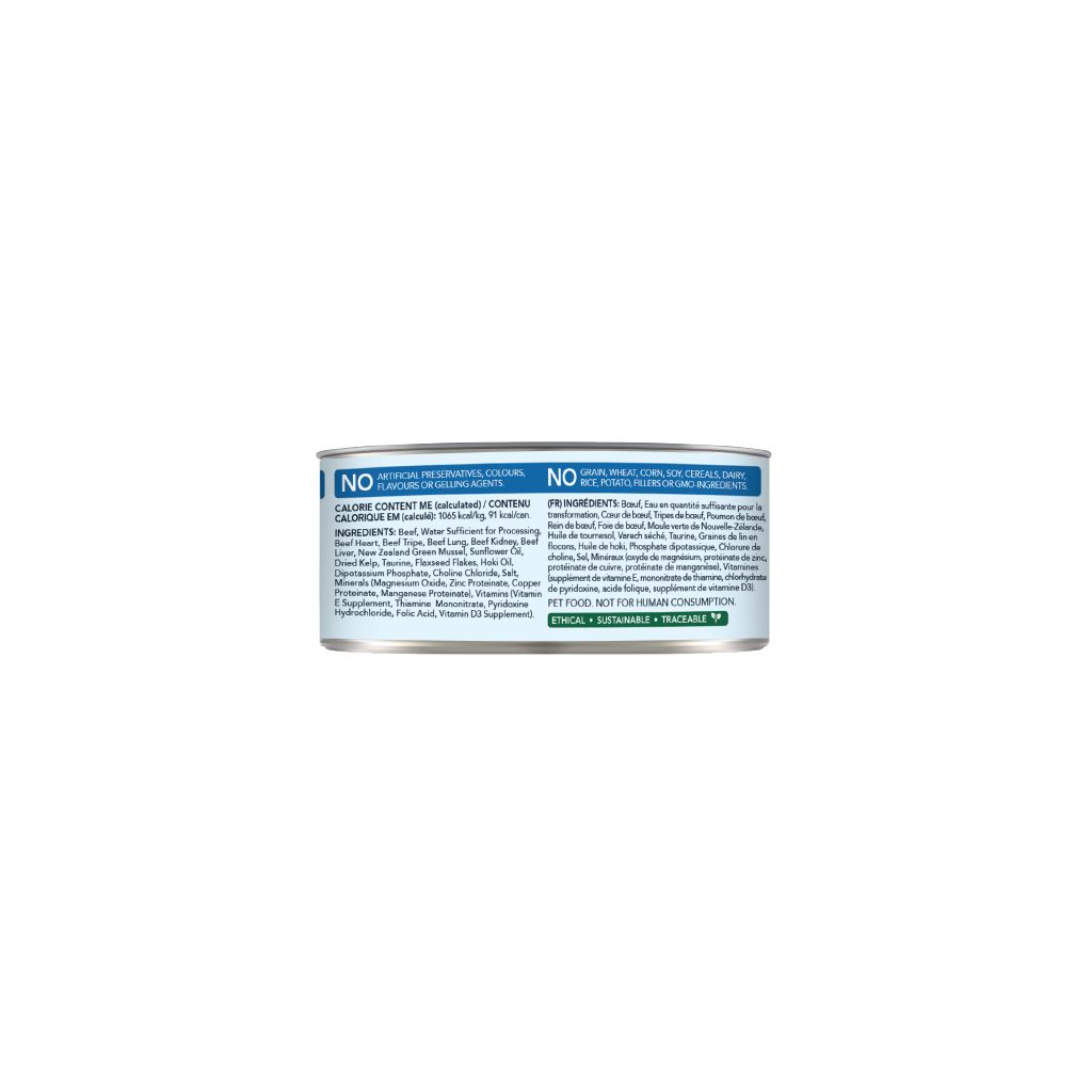 Beef, Water Sufficient for Processing, Beef Heart, Beef Tripe, Beef Lung, Beef Kidney, Beef Liver, New Zealand Green Mussel, Sunflower Oil, Dried Kelp, Taurine, Flaxseed Flakes, Hoki Oil, Dipotassium Phosphate, Choline Chloride, Salt, Minerals (Magnesium Oxide, Zinc Proteinate, Copper Proteinate, Manganese Proteinate), Vitamins (Vitamin E Supplement, Thiamine Mononitrate, Pyridoxine Hydrochloride, Folic Acid, Vitamin D3 Supplement).